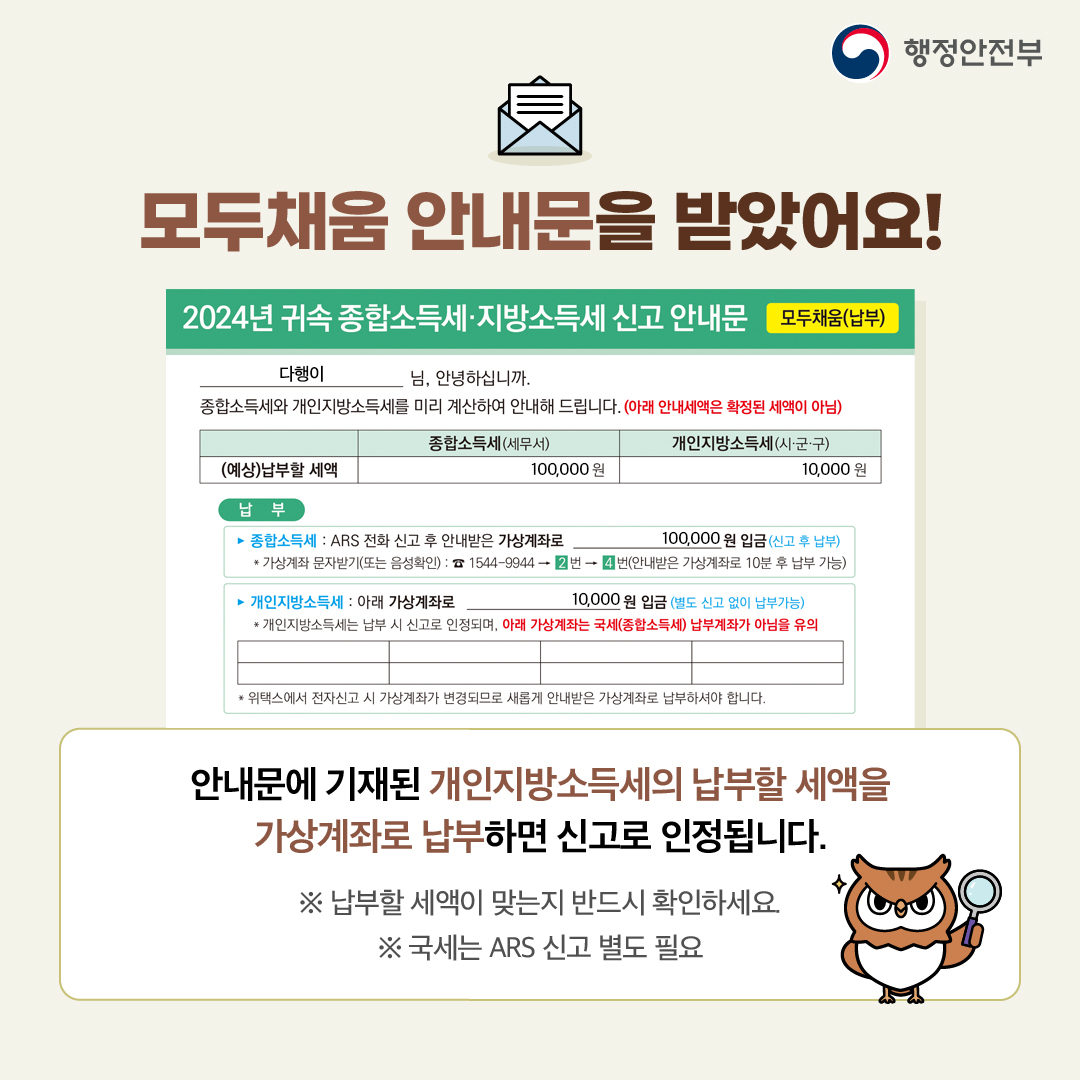 이 안내문을 받은 분은 ARS 전화 한 통(☎1544-9944)으로 종합소득세를 간편하게 신고할 수 있으며, 지방소득세는 안내문 하단의 가상계좌로 납부만 하면 됩니다.