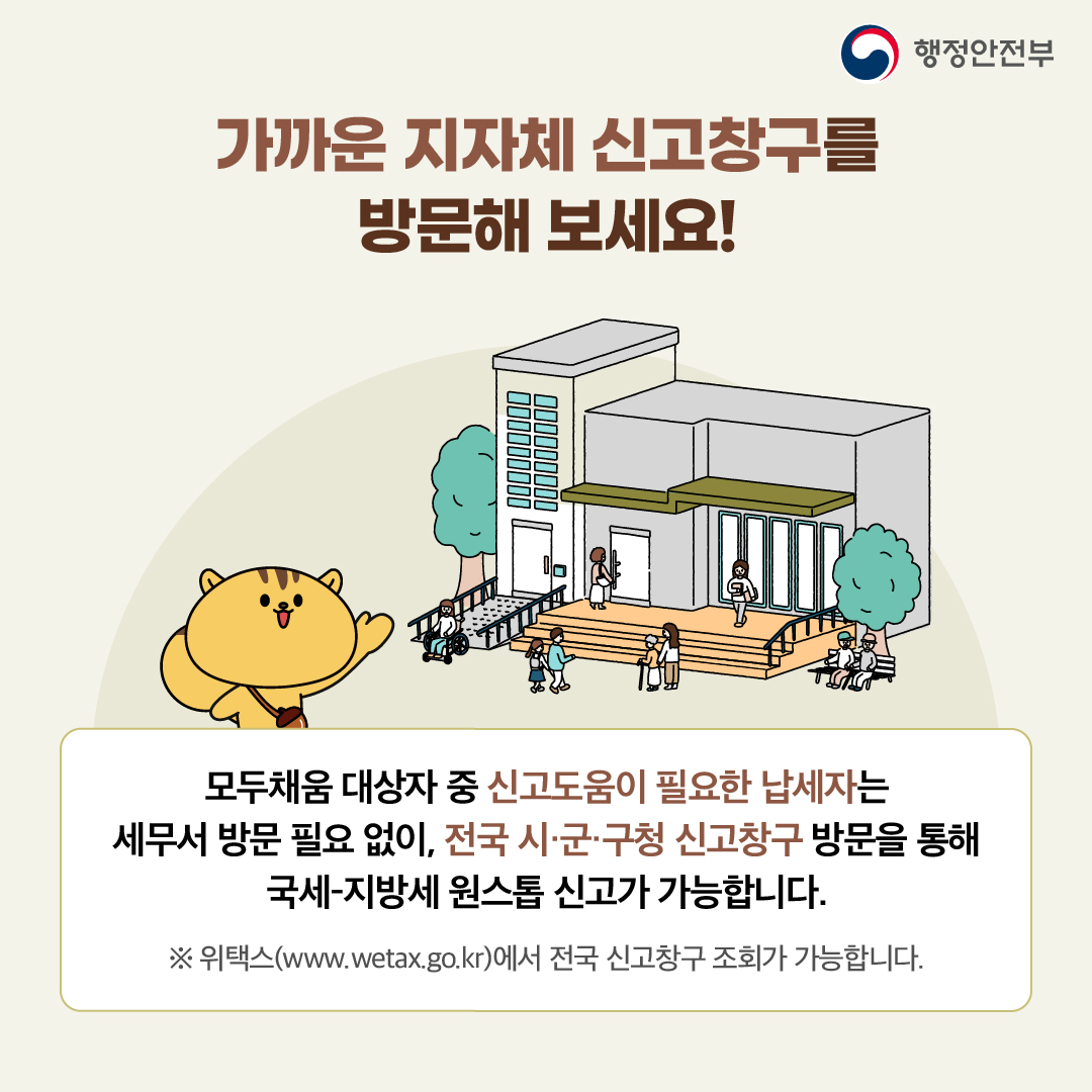 전자신고가 어렵다면, 모두채움 안내문과 신분증을 지참해 가까운 신고창구를 직접 방문하여 한 번에 종합소득세와 개인지방소득세 신고가 가능합니다. 위택스 홈페이지에서 위치를 검색해보세요.